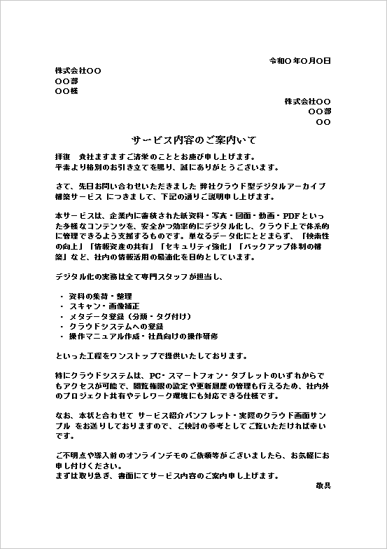 なお、本状と合わせて サービス紹介パンフレット・実際のクラウド画面サンプル をお送りしておりますので、ご検討の参考としてご覧いただければ幸いです。